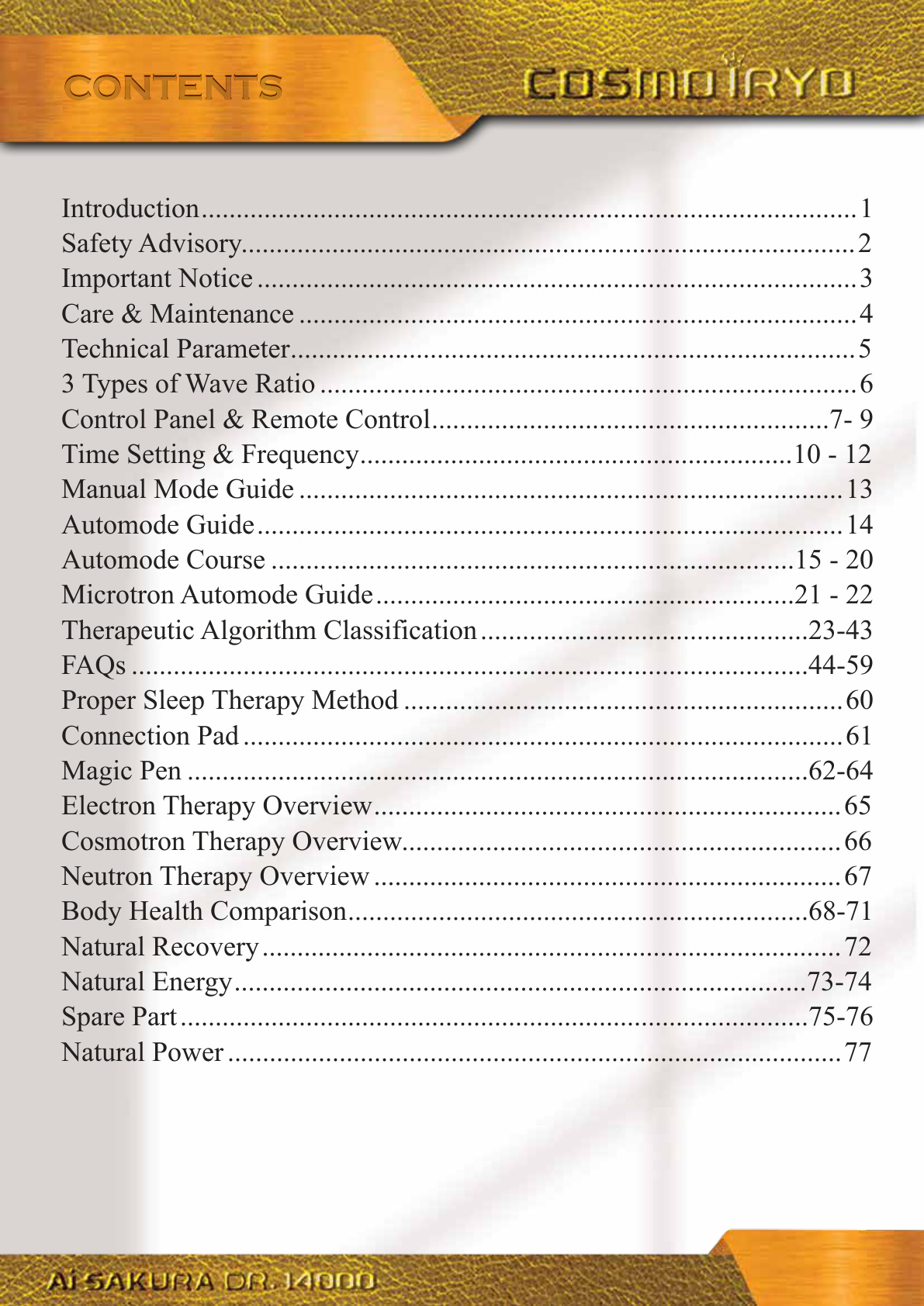 Introduction..............................................................................................1 Safety Advisory........................................................................................2 Important Notice ......................................................................................3 Care & Maintenance ................................................................................4 Technical Parameter.................................................................................5 3 Types of Wave Ratio .............................................................................6 Control Panel & Remote Control.........................................................7- 9 Time Setting & Frequency..............................................................10 - 12 Manual Mode Guide ..............................................................................13 Automode Guide....................................................................................14 Automode Course ...........................................................................15 - 20 Microtron Automode Guide............................................................21 - 22 Therapeutic Algorithm Classification...............................................23-43 FAQs .................................................................................................44-59 Proper Sleep Therapy Method ...............................................................60 Connection Pad ......................................................................................61 Magic Pen .........................................................................................62-64 Electron Therapy Overview...................................................................65 Cosmotron Therapy Overview...............................................................66 Neutron Therapy Overview ...................................................................67 Body Health Comparison..................................................................68-71 Natural Recovery...................................................................................72 Natural Energy..................................................................................73-74 Spare Part..........................................................................................75-76 Natural Power ........................................................................................77 CONTENTSCONTENTS