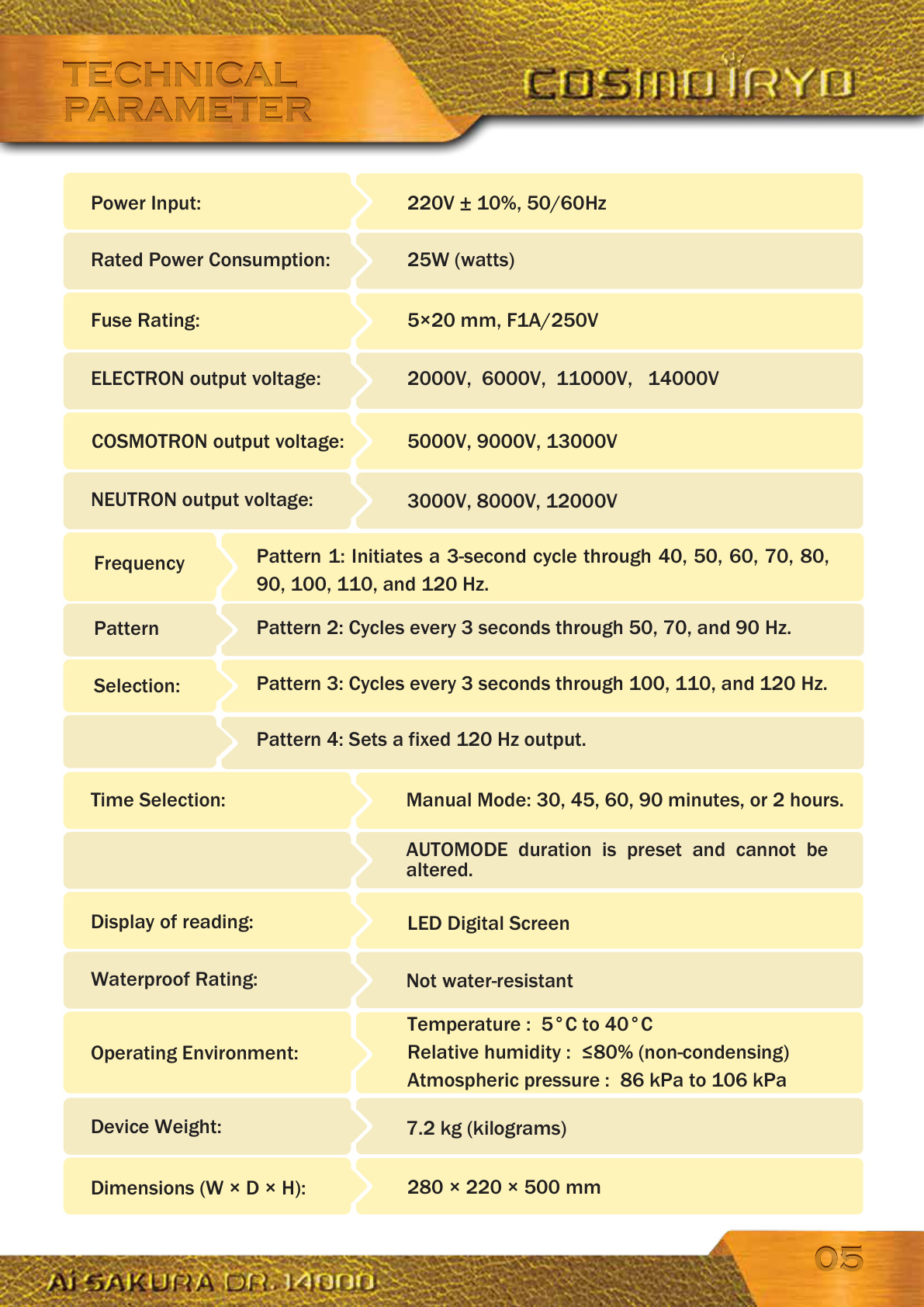 TECHNICAL PARAMETERTECHNICAL PARAMETER 0505 Power Input: 220V ± 10%, 50/60Hz Rated Power Consumption: 25W (watts) Fuse Rating: 5×20 mm, F1A/250V ELECTRON output voltage: 2000V, 6000V, 11000V, 14000V 5000V, 9000V, 13000V NEUTRON output voltage: 3000V, 8000V, 12000V AUTOMODE duration is preset and cannot be altered. Display of reading: LED Digital ScreenTime Selection: Manual Mode: 30, 45, 60, 90 minutes, or 2 hours. Not water-resistant Waterproof Rating: 7.2 kg (kilograms) Device Weight:Temperature : 5°C to 40°C Relative humidity : ≤80% (non-condensing) Atmospheric pressure : 86 kPa to 106 kPaOperating Environment: 280 × 220 × 500 mm Dimensions (W × D × H):COSMOTRON output voltage: Pattern 1: Initiates a 3-second cycle through 40, 50, 60, 70, 80, 90, 100, 110, and 120 Hz. Pattern 2: Cycles every 3 seconds through 50, 70, and 90 Hz. Pattern 3: Cycles every 3 seconds through 100, 110, and 120 Hz. Pattern 4: Sets a fixed 120 Hz output.Frequency Pattern Selection:
