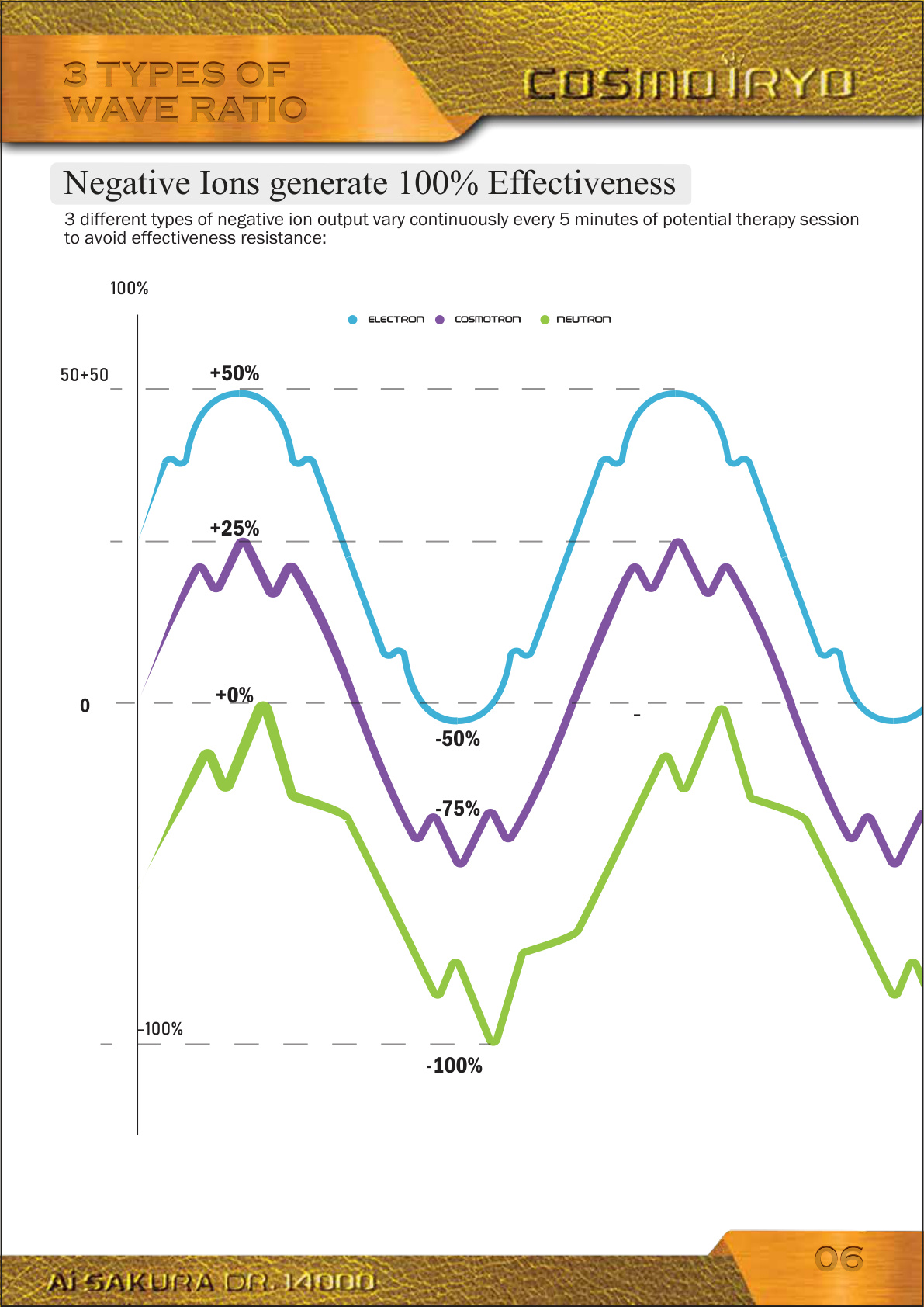 3 different types of negative ion output vary continuously every 5 minutes of potential therapy session to avoid effectiveness resistance: Negative Ions generate 100% Effectiveness +50% +25% +0% -50% -75% -100% 3 TYPES OF WAVE RATIO3 TYPES OF WAVE RATIO 0606