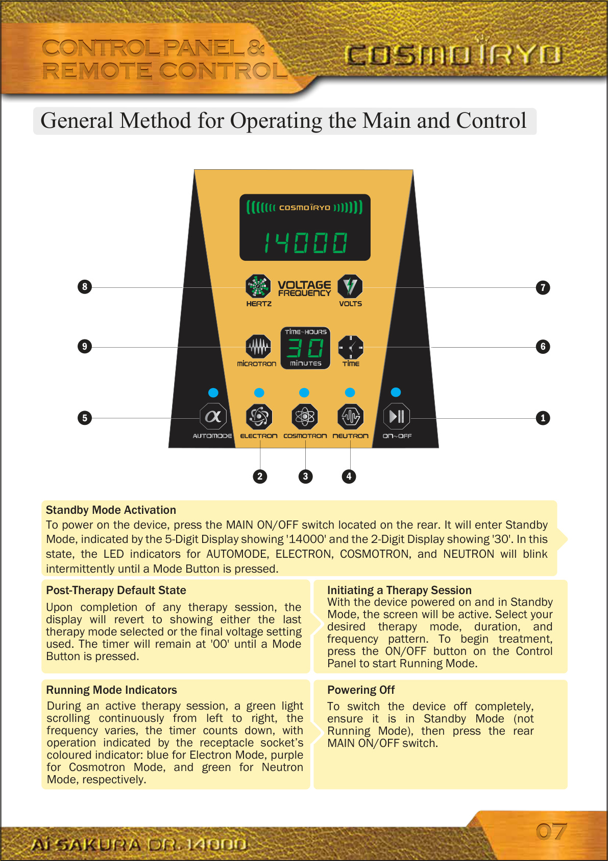 30/gid0006914000 To power on the device, press the MAIN ON/OFF switch located on the rear. It will enter Standby Mode, indicated by the 5-Digit Display showing '14000' and the 2-Digit Display showing '30'. In this state, the LED indicators for AUTOMODE, ELECTRON, COSMOTRON, and NEUTRON will blink intermittently until a Mode Button is pressed.General Method for Operating the Main and Control 167 4 3 28 5 Upon completion of any therapy session, the display will revert to showing either the last therapy mode selected or the final voltage setting used. The timer will remain at '00' until a Mode Button is pressed. During an active therapy session, a green light scrolling continuously from left to right, the frequency varies, the timer counts down, with operation indicated by the receptacle socket’s coloured indicator: blue for Electron Mode, purple for Cosmotron Mode, and green for Neutron Mode, respectively.With the device powered on and in Standby Mode, the screen will be active. Select your desired therapy mode, duration, and frequency pattern. To begin treatment, press the ON/OFF button on the Control Panel to start Running Mode. To switch the device off completely, ensure it is in Standby Mode (not Running Mode), then press the rear MAIN ON/OFF switch.Post-Therapy Default StateStandby Mode Activation Initiating a Therapy Session Running Mode Indicators Powering Off9 CONTROL PANEL & REMOTE CONTROLCONTROL PANEL & REMOTE CONTROL 0707