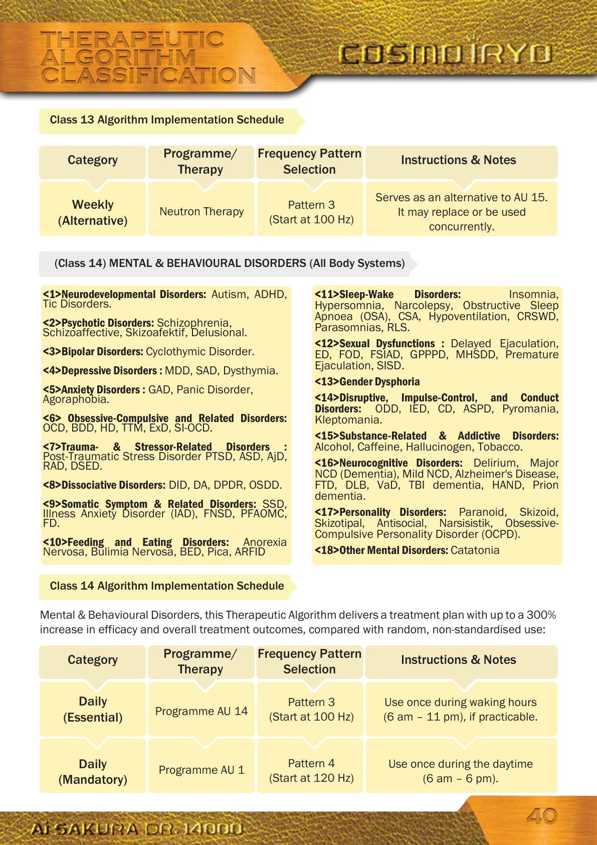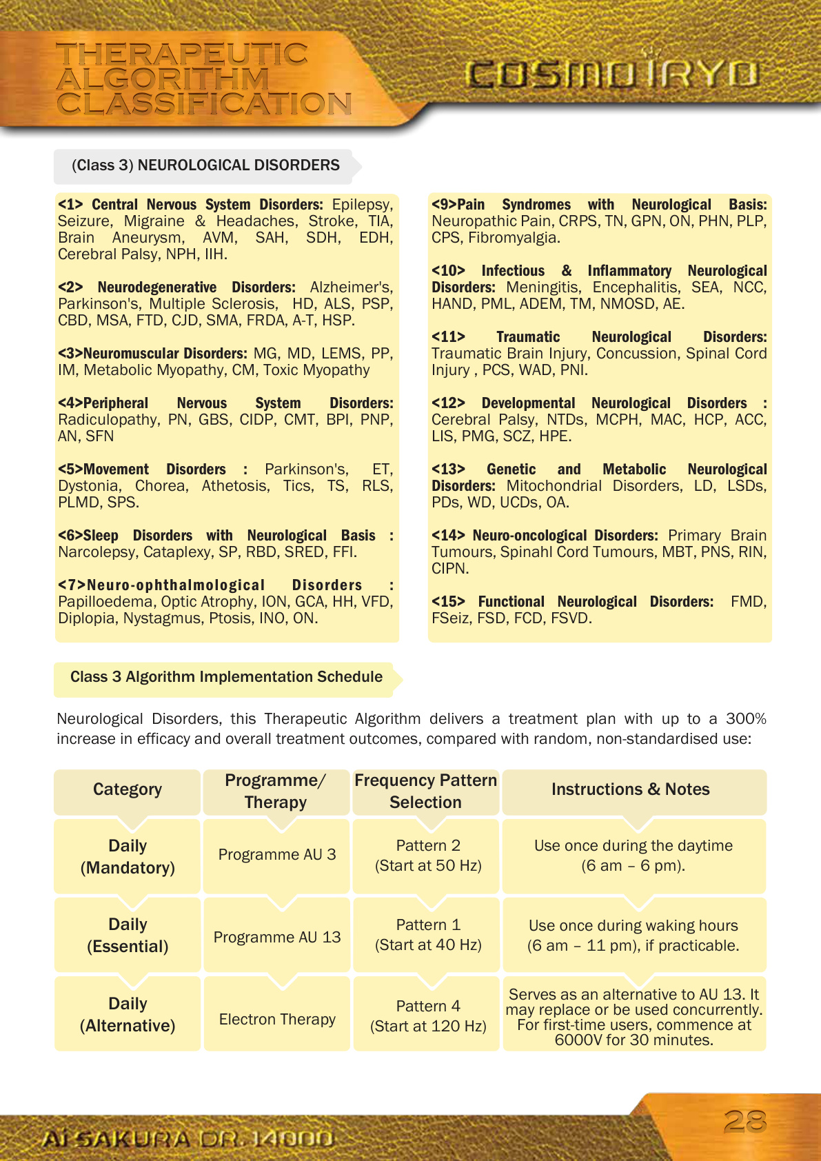 <9>Pain Syndromes with Neurological Basis: Neuropathic Pain, CRPS, TN, GPN, ON, PHN, PLP, CPS, Fibromyalgia. <10> Infectious & Inflammatory Neurological Disorders: Meningitis, Encephalitis, SEA, NCC, HAND, PML, ADEM, TM, NMOSD, AE. <11> Traumatic Neurological Disorders: Traumatic Brain Injury, Concussion, Spinal Cord Injury , PCS, WAD, PNI. <12> Developmental Neurological Disorders : Cerebral Palsy, NTDs, MCPH, MAC, HCP, ACC, LIS, PMG, SCZ, HPE. <13> Genetic and Metabolic Neurological Disorders: Mitochondrial Disorders, LD, LSDs, PDs, WD, UCDs, OA. <14> Neuro-oncological Disorders: Primary Brain Tumours, Spinahl Cord Tumours, MBT, PNS, RIN, CIPN. <15> Functional Neurological Disorders: FMD, FSeiz, FSD, FCD, FSVD.<1> Central Nervous System Disorders: Epilepsy, Seizure, Migraine & Headaches, Stroke, TIA, Brain Aneurysm, AVM, SAH, SDH, EDH, Cerebral Palsy, NPH, IIH. <2> Neurodegenerative Disorders: Alzheimer's, Parkinson's, Multiple Sclerosis, HD, ALS, PSP, CBD, MSA, FTD, CJD, SMA, FRDA, A-T, HSP. <3>Neuromuscular Disorders: MG, MD, LEMS, PP, IM, Metabolic Myopathy, CM, Toxic Myopathy <4>Peripheral Nervous System Disorders: Radiculopathy, PN, GBS, CIDP, CMT, BPI, PNP, AN, SFN <5>Movement Disorders : Parkinson's, ET, Dystonia, Chorea, Athetosis, Tics, TS, RLS, PLMD, SPS. <6>Sleep Disorders with Neurological Basis : Narcolepsy, Cataplexy, SP, RBD, SRED, FFI. <7>Neuro-ophthalmological Disorders : Papilloedema, Optic Atrophy, ION, GCA, HH, VFD, Diplopia, Nystagmus, Ptosis, INO, ON. Neurological Disorders, this Therapeutic Algorithm delivers a treatment plan with up to a 300% increase in efficacy and overall treatment outcomes, compared with random, non-standardised use:Class 3 Algorithm Implementation Schedule THERAPEUTIC ALGORITHM CLASSIFICATIONTHERAPEUTIC ALGORITHM CLASSIFICATION (Class 3) NEUROLOGICAL DISORDERS Category Daily (Mandatory)Programme/ TherapyFrequency Pattern SelectionInstructions & Notes Programme AU 3Pattern 2 (Start at 50 Hz)Use once during the daytime (6 am – 6 pm). Daily (Essential)Programme AU 13Pattern 1 (Start at 40 Hz)Use once during waking hours (6 am – 11 pm), if practicable. Daily (Alternative)Electron TherapyPattern 4 (Start at 120 Hz)Serves as an alternative to AU 13. It may replace or be used concurrently. For first-time users, commence at 6000V for 30 minutes. 2828