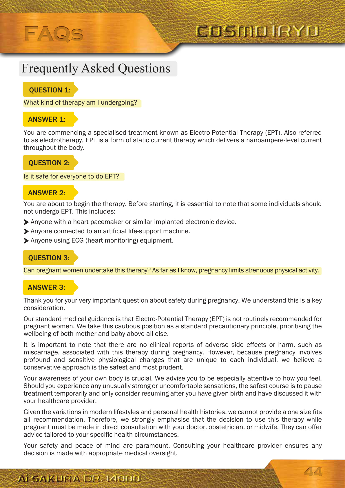 What kind of therapy am I undergoing? You are commencing a specialised treatment known as Electro-Potential Therapy (EPT). Also referred to as electrotherapy, EPT is a form of static current therapy which delivers a nanoampere-level current throughout the body. Thank you for your very important question about safety during pregnancy. We understand this is a key consideration. Our standard medical guidance is that Electro-Potential Therapy (EPT) is not routinely recommended for pregnant women. We take this cautious position as a standard precautionary principle, prioritising the wellbeing of both mother and baby above all else. It is important to note that there are no clinical reports of adverse side effects or harm, such as miscarriage, associated with this therapy during pregnancy. However, because pregnancy involves profound and sensitive physiological changes that are unique to each individual, we believe a conservative approach is the safest and most prudent. Your awareness of your own body is crucial. We advise you to be especially attentive to how you feel. Should you experience any unusually strong or uncomfortable sensations, the safest course is to pause treatment temporarily and only consider resuming after you have given birth and have discussed it with your healthcare provider. Given the variations in modern lifestyles and personal health histories, we cannot provide a one size fits all recommendation. Therefore, we strongly emphasise that the decision to use this therapy while pregnant must be made in direct consultation with your doctor, obstetrician, or midwife. They can offer advice tailored to your specific health circumstances. Your safety and peace of mind are paramount. Consulting your healthcare provider ensures any decision is made with appropriate medical oversight.Can pregnant women undertake this therapy? As far as I know, pregnancy limits strenuous physical activity.You are about to begin the therapy. Before starting, it is essential to note that some individuals should not undergo EPT. This includes:Is it safe for everyone to do EPT?QUESTION 1: ANSWER 1: QUESTION 2: ANSWER 2: QUESTION 3: ANSWER 3:Anyone with a heart pacemaker or similar implanted electronic device. Anyone connected to an artificial life-support machine. Anyone using ECG (heart monitoring) equipment. FAQsFAQs Frequently Asked Questions 4444