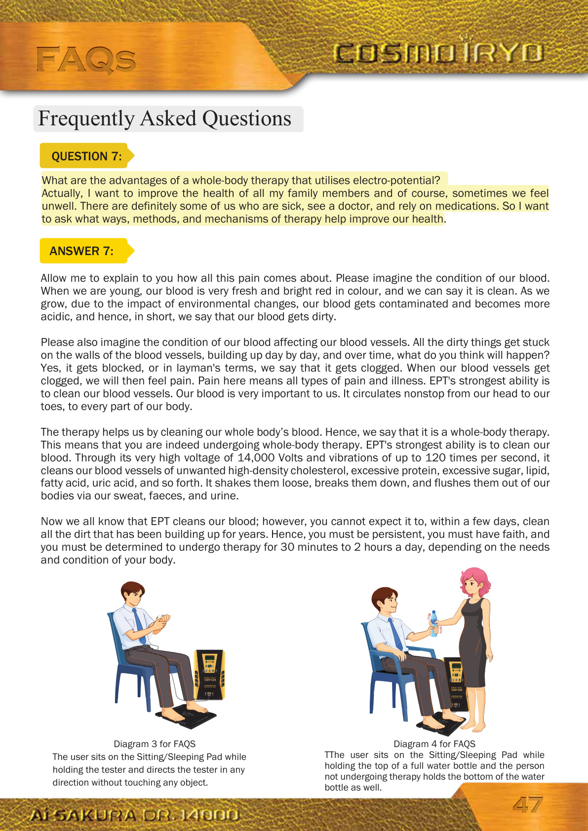 Allow me to explain to you how all this pain comes about. Please imagine the condition of our blood. When we are young, our blood is very fresh and bright red in colour, and we can say it is clean. As we grow, due to the impact of environmental changes, our blood gets contaminated and becomes more acidic, and hence, in short, we say that our blood gets dirty. Please also imagine the condition of our blood affecting our blood vessels. All the dirty things get stuck on the walls of the blood vessels, building up day by day, and over time, what do you think will happen? Yes, it gets blocked, or in layman's terms, we say that it gets clogged. When our blood vessels get clogged, we will then feel pain. Pain here means all types of pain and illness. EPT's strongest ability is to clean our blood vessels. Our blood is very important to us. It circulates nonstop from our head to our toes, to every part of our body. The therapy helps us by cleaning our whole body’s blood. Hence, we say that it is a whole-body therapy. This means that you are indeed undergoing whole-body therapy. EPT's strongest ability is to clean our blood. Through its very high voltage of 14,000 Volts and vibrations of up to 120 times per second, it cleans our blood vessels of unwanted high-density cholesterol, excessive protein, excessive sugar, lipid, fatty acid, uric acid, and so forth. It shakes them loose, breaks them down, and flushes them out of our bodies via our sweat, faeces, and urine. Now we all know that EPT cleans our blood; however, you cannot expect it to, within a few days, clean all the dirt that has been building up for years. Hence, you must be persistent, you must have faith, and you must be determined to undergo therapy for 30 minutes to 2 hours a day, depending on the needs and condition of your body.What are the advantages of a whole-body therapy that utilises electro-potential? Actually, I want to improve the health of all my family members and of course, sometimes we feel unwell. There are definitely some of us who are sick, see a doctor, and rely on medications. So I want to ask what ways, methods, and mechanisms of therapy help improve our health.QUESTION 7: ANSWER 7: Diagram 3 for FAQS The user sits on the Sitting/Sleeping Pad while holding the tester and directs the tester in any direction without touching any object.Diagram 4 for FAQS TThe user sits on the Sitting/Sleeping Pad while holding the top of a full water bottle and the person not undergoing therapy holds the bottom of the water bottle as well. Frequently Asked Questions 88/gid0006988888 88/gid0006988888 FAQsFAQs 4747