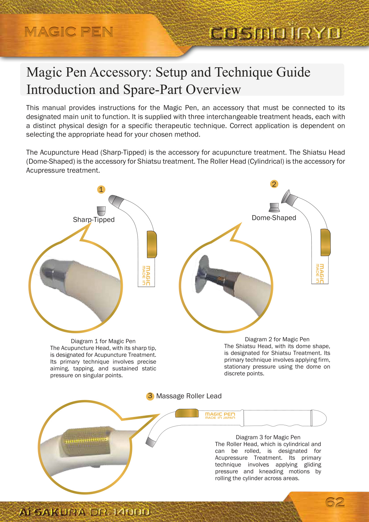 This manual provides instructions for the Magic Pen, an accessory that must be connected to its designated main unit to function. It is supplied with three interchangeable treatment heads, each with a distinct physical design for a specific therapeutic technique. Correct application is dependent on selecting the appropriate head for your chosen method. The Acupuncture Head (Sharp-Tipped) is the accessory for acupuncture treatment. The Shiatsu Head (Dome-Shaped) is the accessory for Shiatsu treatment. The Roller Head (Cylindrical) is the accessory for Acupressure treatment.Magic Pen Accessory: Setup and Technique Guide Introduction and Spare-Part Overview 2 Dome-Shaped1 Sharp-Tipped MAGIC PEN MAGIC PEN Massage Roller Lead3 Diagram 3 for Magic Pen The Roller Head, which is cylindrical and can be rolled, is designated for Acupressure Treatment. Its primary technique involves applying gliding pressure and kneading motions by rolling the cylinder across areas.Diagram 2 for Magic Pen The Shiatsu Head, with its dome shape, is designated for Shiatsu Treatment. Its primary technique involves applying firm, stationary pressure using the dome on discrete points.Diagram 1 for Magic Pen The Acupuncture Head, with its sharp tip, is designated for Acupuncture Treatment. Its primary technique involves precise aiming, tapping, and sustained static pressure on singular points. 6262