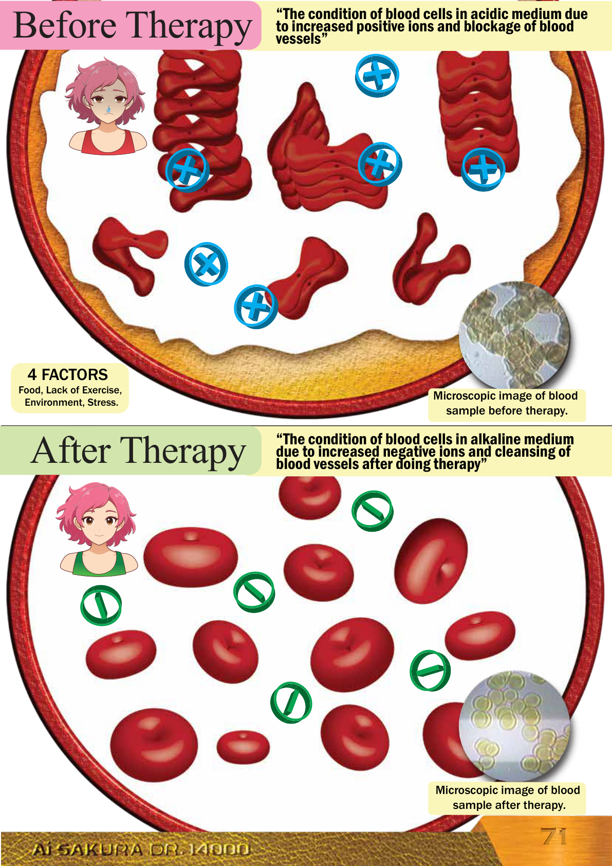 Microscopic image of blood sample before therapy. Microscopic image of blood sample after therapy. 4 FACTORS Food, Lack of Exercise, Environment, Stress. 7171 Before Therapy“The condition of blood cells in acidic medium due to increased positive ions and blockage of blood vessels” After Therapy“The condition of blood cells in alkaline medium due to increased negative ions and cleansing of blood vessels after doing therapy”