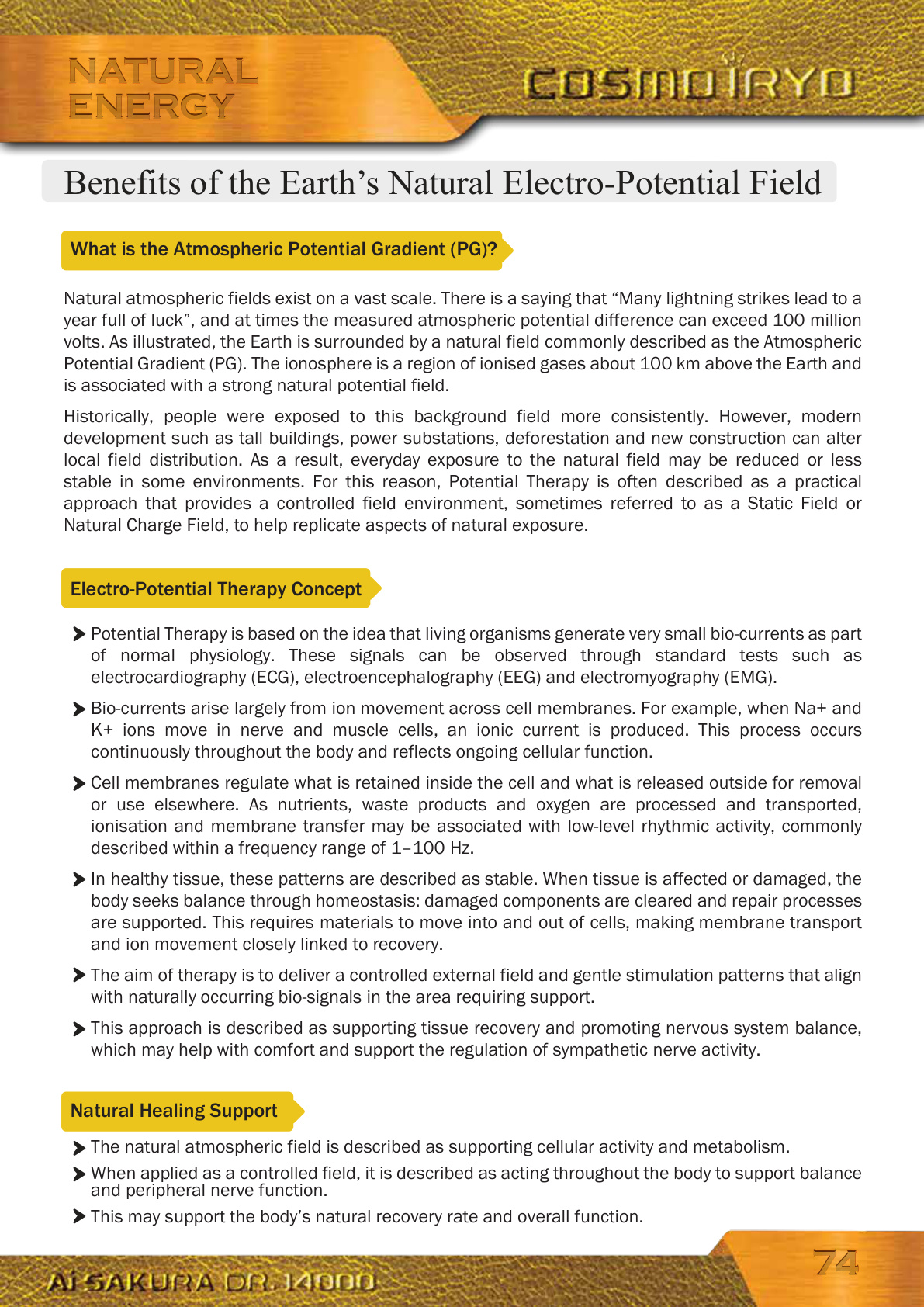 Benefits of the Earth’s Natural Electro-Potential Field 7474 NATURAL ENERGYNATURAL ENERGY Natural atmospheric fields exist on a vast scale. There is a saying that “Many lightning strikes lead to a year full of luck”, and at times the measured atmospheric potential difference can exceed 100 million volts. As illustrated, the Earth is surrounded by a natural field commonly described as the Atmospheric Potential Gradient (PG). The ionosphere is a region of ionised gases about 100 km above the Earth and is associated with a strong natural potential field. Historically, people were exposed to this background field more consistently. However, modern development such as tall buildings, power substations, deforestation and new construction can alter local field distribution. As a result, everyday exposure to the natural field may be reduced or less stable in some environments. For this reason, Potential Therapy is often described as a practical approach that provides a controlled field environment, sometimes referred to as a Static Field or Natural Charge Field, to help replicate aspects of natural exposure.What is the Atmospheric Potential Gradient (PG)? Potential Therapy is based on the idea that living organisms generate very small bio-currents as part of normal physiology. These signals can be observed through standard tests such as electrocardiography (ECG), electroencephalography (EEG) and electromyography (EMG). Bio-currents arise largely from ion movement across cell membranes. For example, when Na+ and K+ ions move in nerve and muscle cells, an ionic current is produced. This process occurs continuously throughout the body and reflects ongoing cellular function. Cell membranes regulate what is retained inside the cell and what is released outside for removal or use elsewhere. As nutrients, waste products and oxygen are processed and transported, ionisation and membrane transfer may be associated with low-level rhythmic activity, commonly described within a frequency range of 1–100 Hz. In healthy tissue, these patterns are described as stable. When tissue is affected or damaged, the body seeks balance through homeostasis: damaged components are cleared and repair processes are supported. This requires materials to move into and out of cells, making membrane transport and ion movement closely linked to recovery. The aim of therapy is to deliver a controlled external field and gentle stimulation patterns that align with naturally occurring bio-signals in the area requiring support. This approach is described as supporting tissue recovery and promoting nervous system balance, which may help with comfort and support the regulation of sympathetic nerve activity. The natural atmospheric field is described as supporting cellular activity and metabolism. When applied as a controlled field, it is described as acting throughout the body to support balance and peripheral nerve function. This may support the body’s natural recovery rate and overall function.Electro-Potential Therapy Concept Natural Healing Support