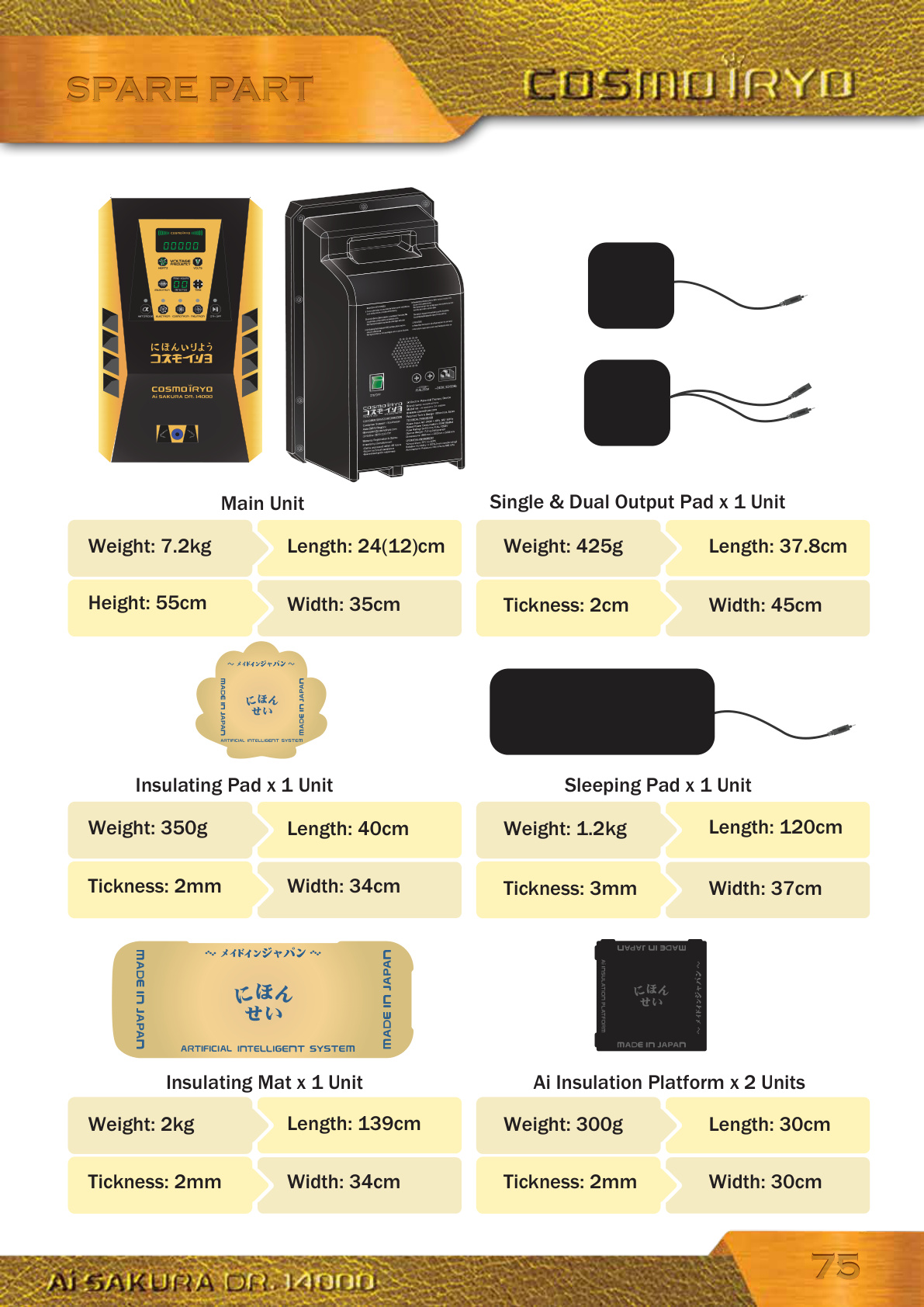 7575 Weight: 7.2kg Height: 55cmMain Unit Width: 35cmLength: 24(12)cm Insulating Pad x 1 Unit Sleeping Pad x 1 Unit Weight: 350g Length: 40cm Width: 34cm Tickness: 2mmWeight: 1.2kg Length: 120cm Width: 37cm Tickness: 3mmWeight: 425g Tickness: 2cm Insulating Mat x 1 Unit Ai Insulation Platform x 2 Units Weight: 300g Length: 30cm Tickness: 2mm Width: 30cmWeight: 2kg Length: 139cm Tickness: 2mm Width: 34cmSingle & Dual Output Pad x 1 Unit Length: 37.8cm Width: 45cm SPARE PARTSPARE PART /gid00069
