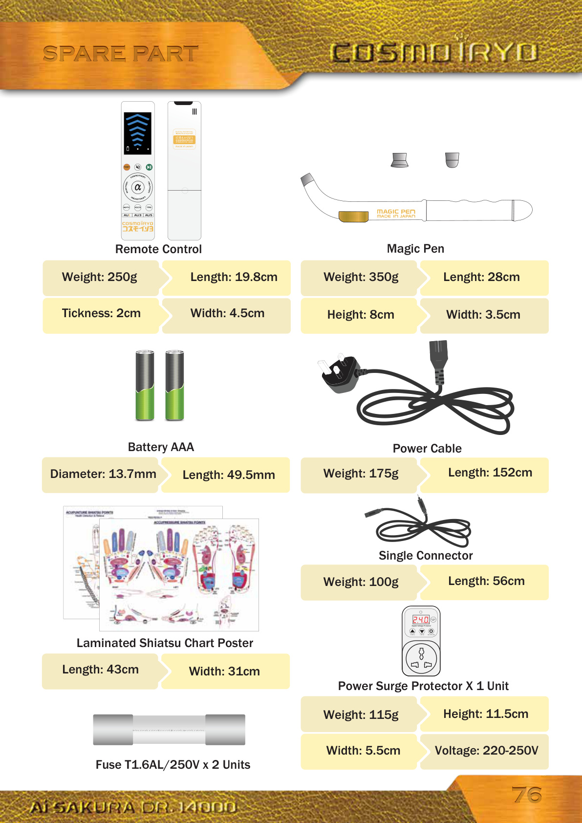 7676 Weight: 250g Length: 19.8cmRemote Control Diameter: 13.7mm Length: 49.5mmBattery AAAWidth: 4.5cm Tickness: 2cmWeight: 350g Lenght: 28cm Height: 8cm Width: 3.5cmMagic Pen Length: 43cm Width: 31cmWeight: 175g Length: 152cm Power Cable Weight: 100g Length: 56cmSingle Connector Laminated Shiatsu Chart Poster Weight: 115g Height: 11.5cmPower Surge Protector X 1 Unit Fuse T1.6AL/250V x 2 UnitsVoltage: 220-250V Width: 5.5cm SPARE PARTSPARE PART